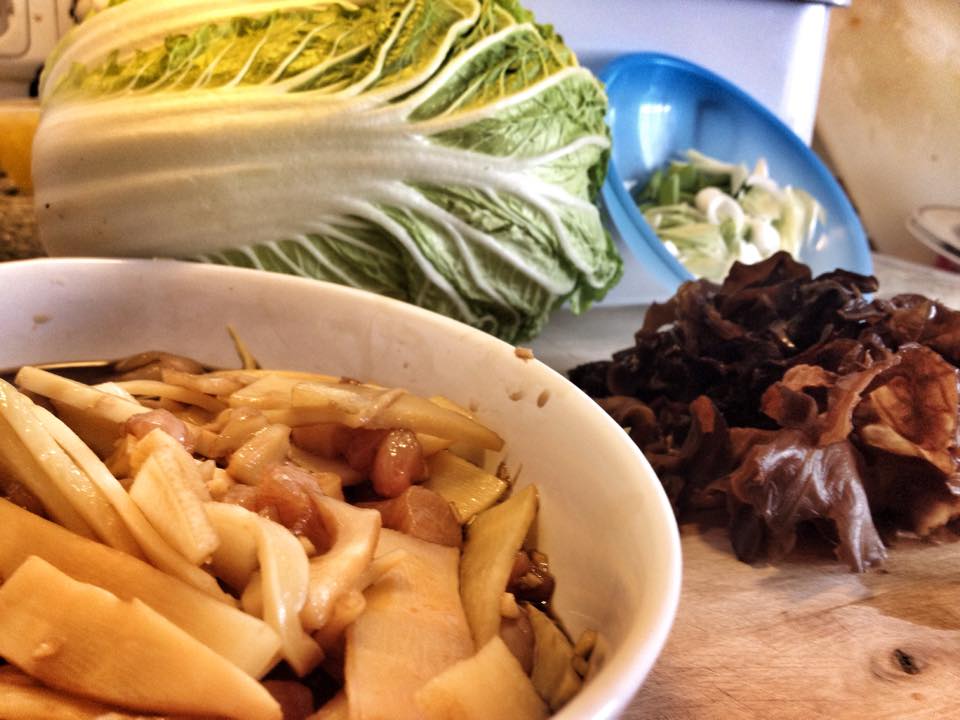 Jetzt den Chinakohl in ein Zentimeter breite Streifen schneiden und den Jungzwiebel fein schneiden. Die gequellten Ohrenpilze schneiden. Die Vorbereitungen sind fertig.