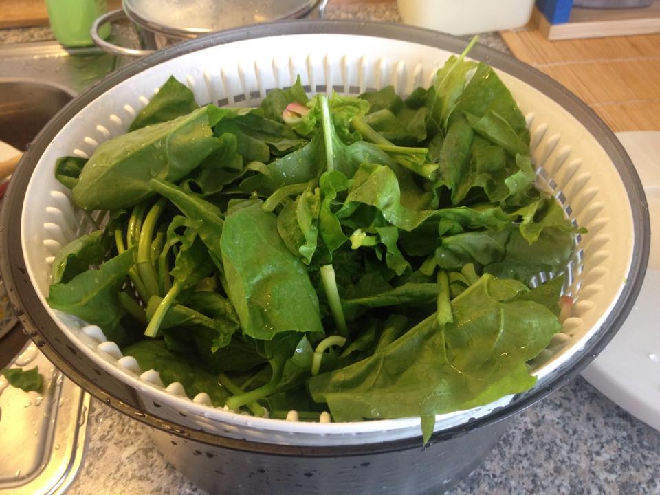 die Spinat Ernte vor dem Sommer ist abgschlossen. Mitte August werd ich wohl nochmals Spinat säen … 100 % Bio hat ein paar Läuse als Nachteil, aber die hab ich mit gründlicher Wäsche ab bekommen.