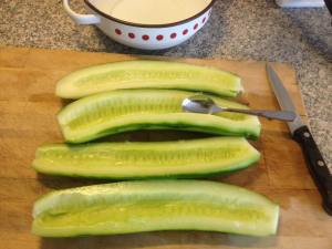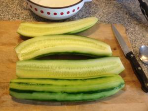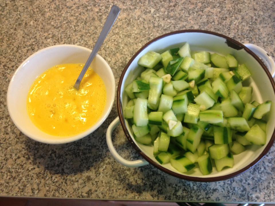 - Eier verquirln und Gurke schneiden, eine kleine Knoblauch dazu
