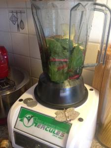 Bei meiner morgendlichen Giessaktion am Krauti, nehm ich mir Gänsefuss und Brennnesseln mit heim. Zu Hause zupfe ich die Brennnesselblätter ab…ja, ich hab keine Lust auf die Fasern in den Stängeln, die kriegt nicht mal der Hercules smoothie. Und jetzt tragen die Brennnessel schon Samen und die Fasern sind noch mehr ausgeprägt. Im Frühling ist mir das egal, da verwend ich auch die Stängel. Da ich eher wenige Blätter vom Gänsefuss ergattert habe, nehm ich noch bisschen Mangold dazu.