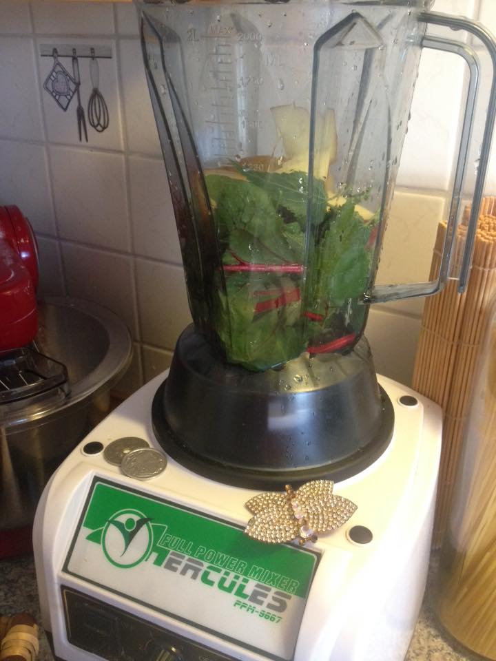 Alles in den Hercules und noch ein Apfel -los gehts! Es wird mal kurz laut -so an die 60 Sekunden und da is er schon mein Greenie. Und schmecken tut der -weiß garnicht, warum ich mir schon so lange keinen mehr gemixt hab. Naja, ab heut wird ja alles anders! Darauf trinke ich 😀