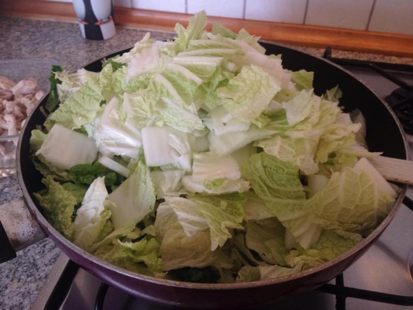 - Der Topf wird ziemlich voll. Bitte die ganze Zeit pfannenrühren, bis der Chinakohl fertig gebraten ist. Dauert nicht lange – bei der Menge circa 5 Minuten.