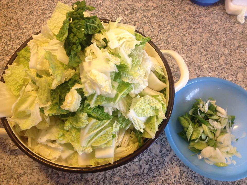 4. September 2015 Chinakohl_1 Ein ganzer Kopf Chinakohl und 2 Jungzwiebel. Gewaschen und geschnitten. Hätte auch gerne noch Ingwer dazu, leider war er aus.