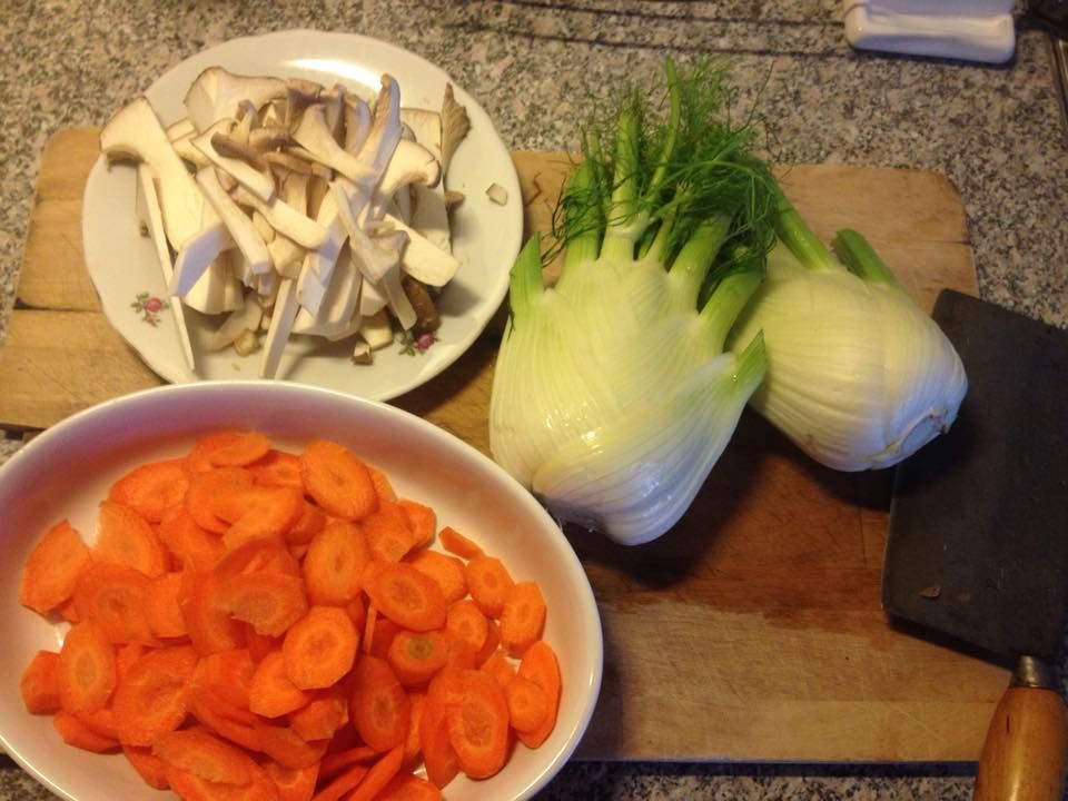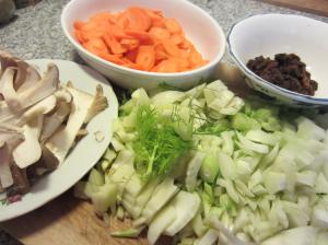 Vier Karotten schälen und schneiden, zwei Fenchel waschen und schneiden, Bio-Kräuterseitlinge aus dem Marchfeld nicht waschen nur schneiden und Rosinen um das Gericht geschmacklich abzurunden. Je nach Lust und Laune. Keine Zwiebel oder Knoblauch, der Fenchel soll geschmacklich der Star bleiben! Das Rezept reicht locker für vier Leute.