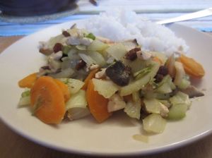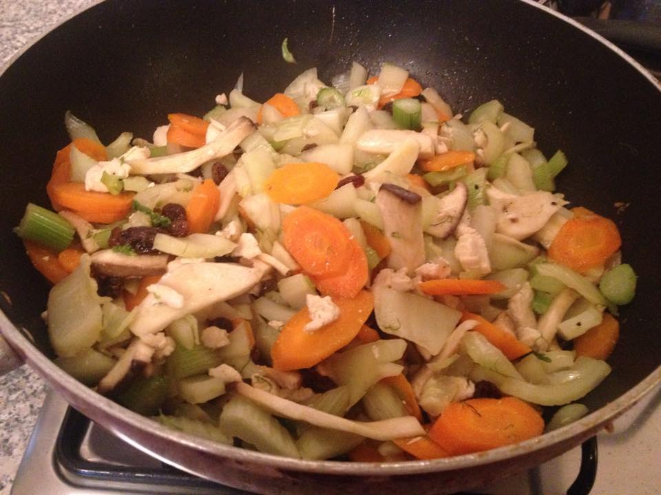 Zuerst die Karotten auf mittlerer Flamme in Öl braten -bitte einigermassen dabei bleiben, sonst braten sie schnell an. Es dauert ein paar Minuten …jetzt der Fenchel und die Rosinen dazu und alles rühren bis es fast gar ist. Pfeffern und salzen, Fleisch und Pilze dazu und braten bis alles gar ist. Die Pilze nicht zu sehr zerfallen lassen, so dass sie noch resch sind. Sofort anrichten und mit Reis servieren… mmmh!