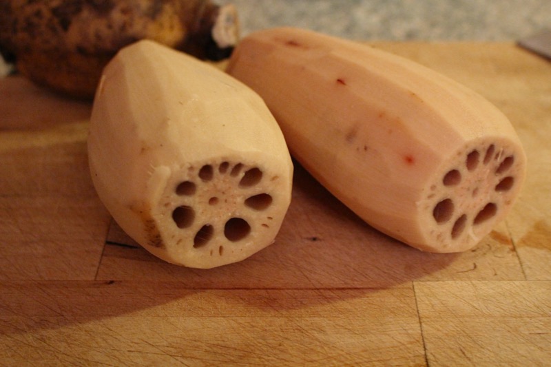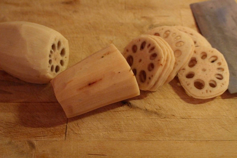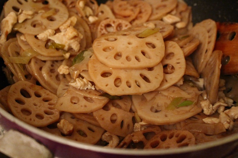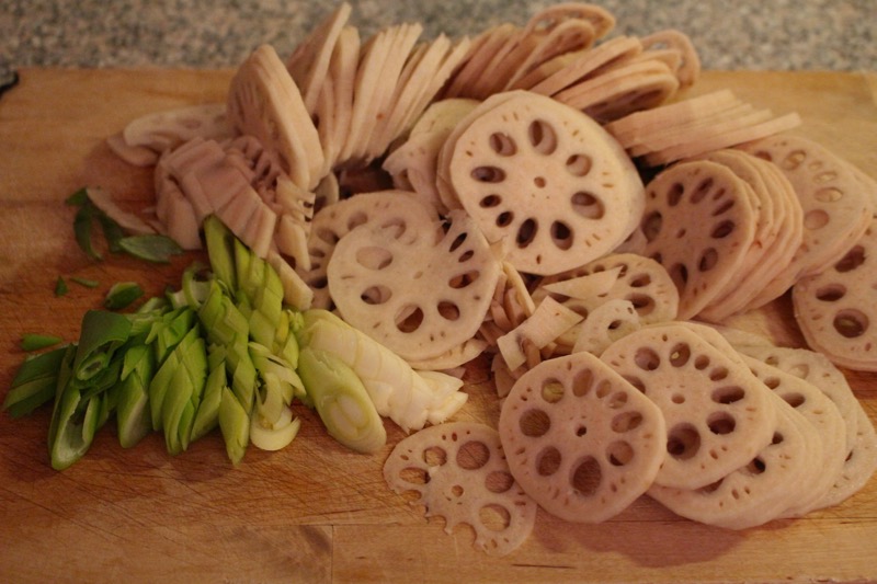 Wie immer ist das Rezept ziemlich einfach. Lotuswurzel schälen und fein schneiden. Einen Jungzwiebel ebenfalls. Alles anbraten und mit chinesischem Essig löschen, Deckel drauf und circa fünf Minuten dünsten. Eventuell bisschen Wasser dazu. Wenn man mag kann man das Gericht mit Fleisch kochen, dazu einfach Brust von Huhn oder Pute schnetzeln und dazu geben. Zum Schluss noch salzen und fertig :).