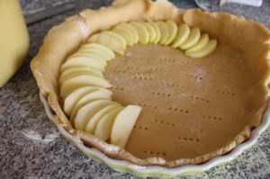 - Den Backofen je nach Empfehlung des Herstellers einschalten, bei mir sind das 150 – 170 Grad Ober und Unterhitze für Mürbteig. Für den Belag die Äpfel schälen, vierteln und das Kerngehäuse ausschneiden. Apfelviertel in dünne Scheiben schneiden und im Kreis von außen beginnend auflegen.