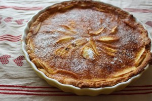 - Schlagobers, 2 Eier, restlichen Zucker und den Vanillezucker mixen und über die Tarte giessen. Noch weitere 15 – 20 Minuten fertig backen. Die Apfeltarte auskühlen lassen und danach leicht mit Staubzucker bestäuben.