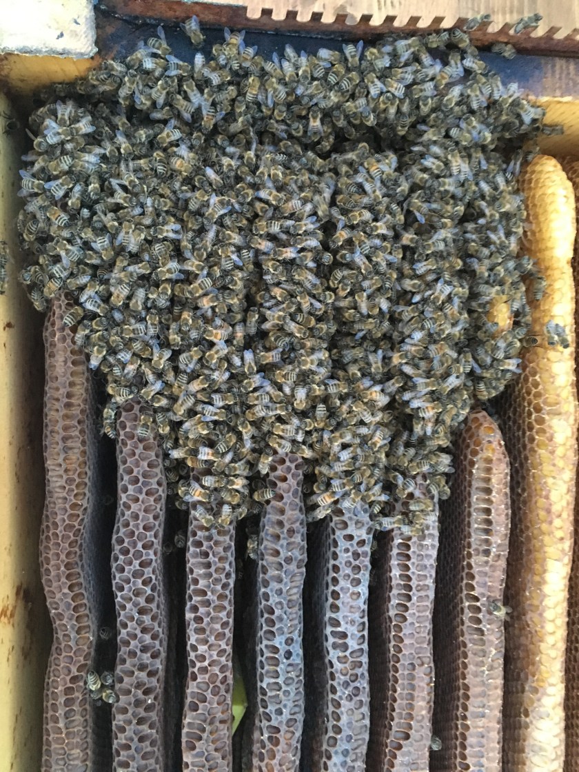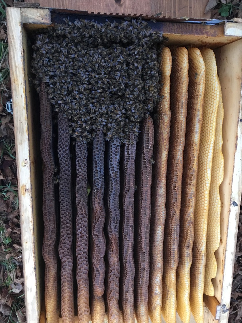 Volk in der braunen Kiste, etwas kleiner aber auch fein. Man sieht die Bienen sind schön versammelt in der Wintertraube.