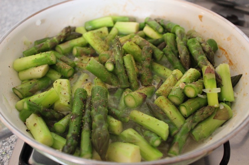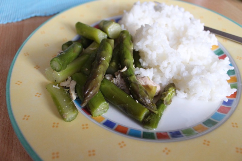 - Jungzwiebel in 1 TL Kokosfett anbraten, Spargel mit einwenig Wasser hinzugeben – Deckel drauf und circa 7 min bei mittlerer Hitze dünsten lassen. Dann umrühren und mit Koriander, frisch geriebener Muskatnuss und Pfeffer würzen, wieder umrühren und geschnetzeltes Fleisch hinzugeben und nochmals mit Deckel 3 bis 5 min dünsten lassen. Zum Schluss eine Prise Salz und mit Reis anrichten. Mmmmh der Frühling schmeckt einfach spargelig.