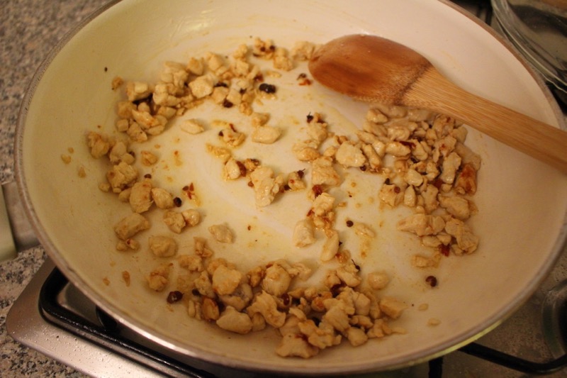 Pfanne erhitzen, Öl hinein und Szechuan Pfeffer darin braten, bis er duftet. Dann Fleisch dazu und die Chillies (oder so wie ich den Teelöffel Hot Bean Sauce).