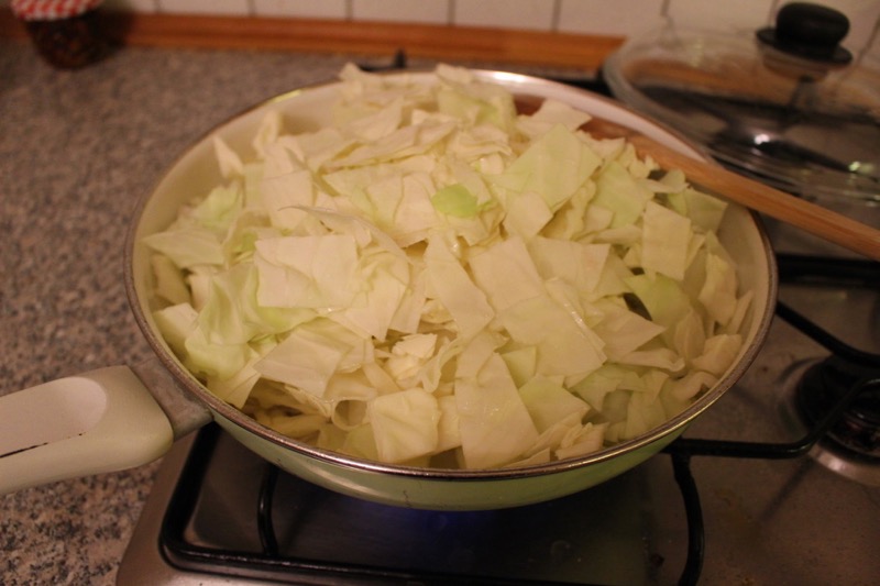 Dann vorsichtig den geschnittenen und gewaschen Weißkohl in die Pfanne. Mehr hätts nimma sein dürfen 😉 Salzen und einmal von außen in die Mitte und von unten nach oben mit dem Kochlöffel, dann Deckel drauf und die Hitze bisschen reduzieren. Ein paar Minuten so dünsten lassen.