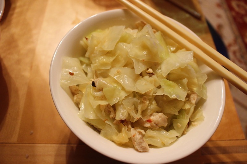 Zutaten für 4 Personen: 500 g Weißkohl, 10 Szechuan-Pfefferkörner, gerne auch mehr, 3 trockene Chillies (hatte keine -hab anstelle 1/2 TL Hot Bean Sauce -sehr scharf- verwendet), 1 TL weißen Reisessig, 1 Spritzer Sesamöl, Zucker & Salz und Öl natürlich.