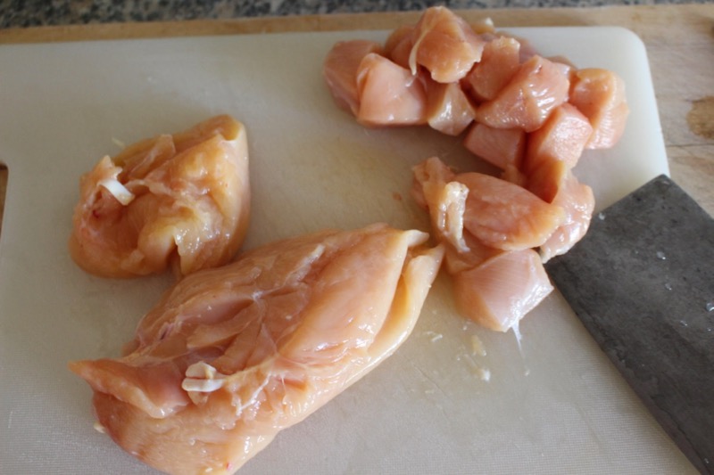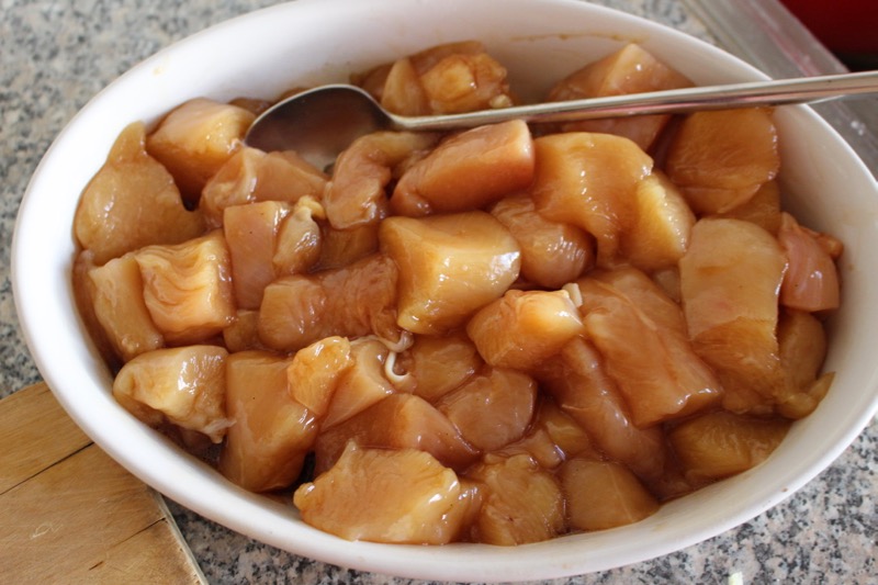 3 Hühnerbrüste waschen und in mundgerechte Stücke schneiden. In die Marinade und mindestens 20 Min darin lassen -gelegentlich umrühren.