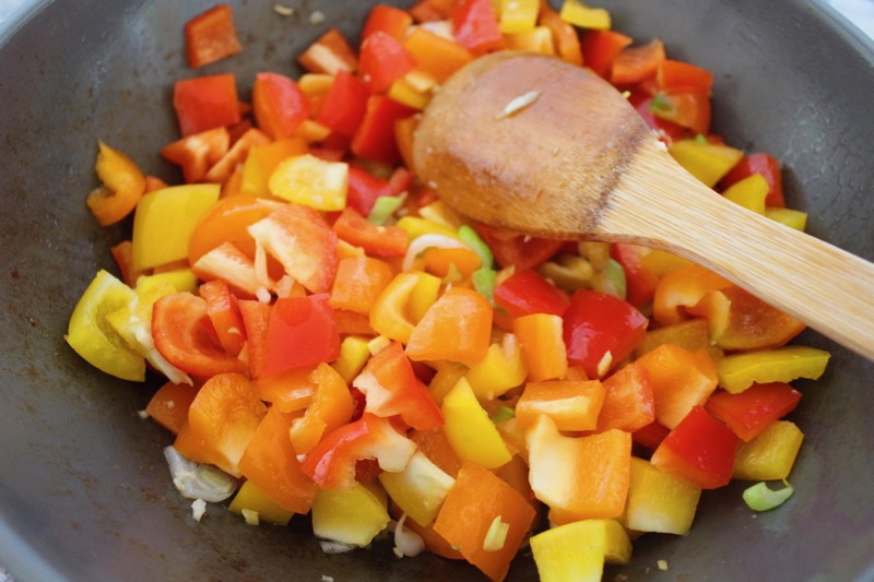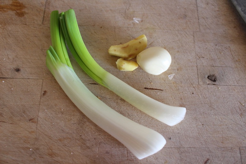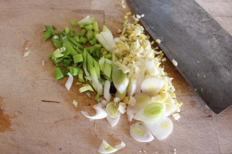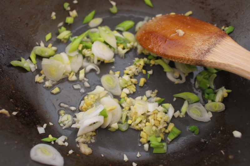 Bisschen Öl in die Pfanne, Jungzwiebel, Ingwer und Knoblauch rein. Kurz rühren und Gemüse dazu.