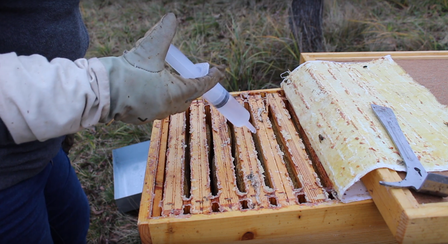 Oxalsäure kann man träufeln oder sprühen -bei der Bienenkiste allerdings nur träufeln. Der Wirkungsgrad der Oxalsäure liegt bei gut 90 % mit Zucker um circa 5% mehr. Wenn man die Oxalsäure sprüht braucht man keinen Zucker -da man die Säure bereits sehr gut verteilt durch das Sprühen. Die Außentemperaturen sollten zwischen 0 und 5 Grad plus liegen.