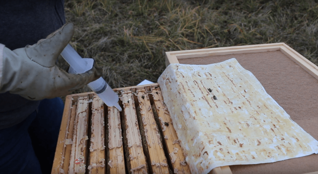 Das erste Mal, daß ich die Oxalsäurebehandlung bei Rähmchen mache. Bisschen komisch ist das schon, vorallem weiß ich jetzt immer noch nicht, wie es den Völkern geht, weil ich sie ja nicht gesehen habe. Also bei der „Blumen“ Einraumbeute habe ich sie gesehen, aber sie sitzen relativ weit unten. Die Rähmchen sind halt auch sehr „groß“. Bei der „Vögel“ Einraumbeute habe ich fast keine Bienen gesehen, aber ich hab sie gehört.