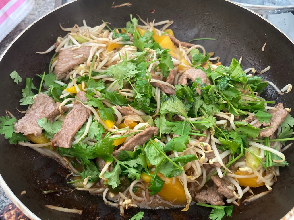 Bevor der Paprika bissfest ist, Sojasprossen dazu, dann das Fleisch, salzen und zum Schluss, wenn das Feuer aus ist den Koriander darüber und einwenig untermengen.