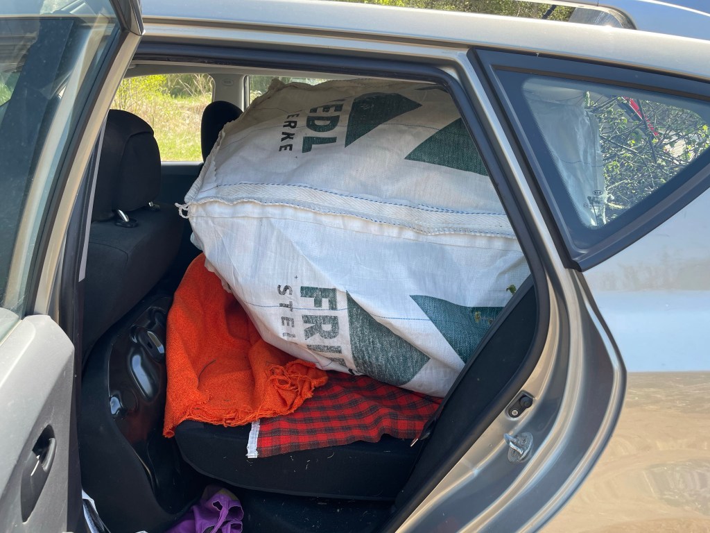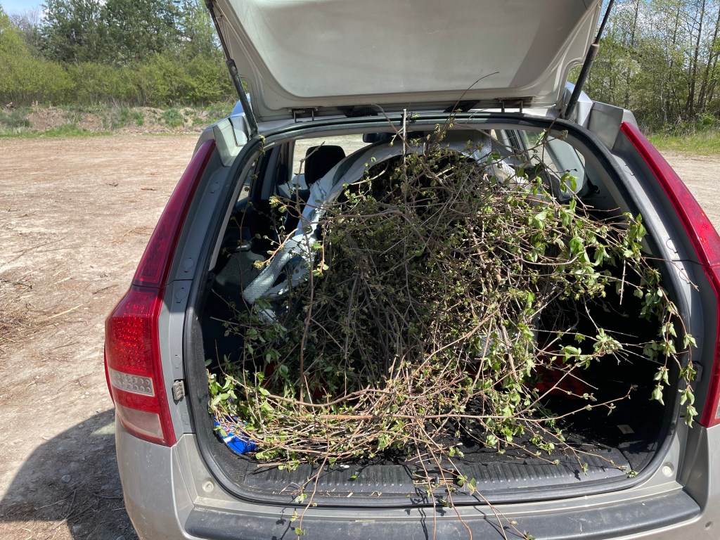 Bis jetzt schaffte ich den Grünschnitt meistens mi dem Häcksler, aber soviel? Da brauche ich ja eine Woche … Vom Terrassenbau im letzten Jahr habe ich noch so große Gewebesäcke, in denen der Schotter zur Befestigung geliefert wurde …und durch einen Freund meines Sohnes bin ich auf die Idee gekommen, diese für den Grünschnitt zu nutzen – zum einfacheren Transport im Auto. Natürlich hab ich einen Kombi ;-).
