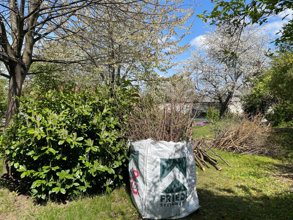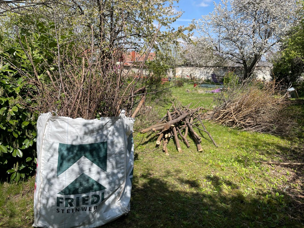 In einer Nachmittags Session – konnte man dann am Ende fast kaum noch Rasen betreten, weil nur mehr Äste darauf rumlagen – dann kamen fast 3 Wochen Kälte und Regen und somit konnte ich erst heute den ganzen Grünschnitt entfernen.