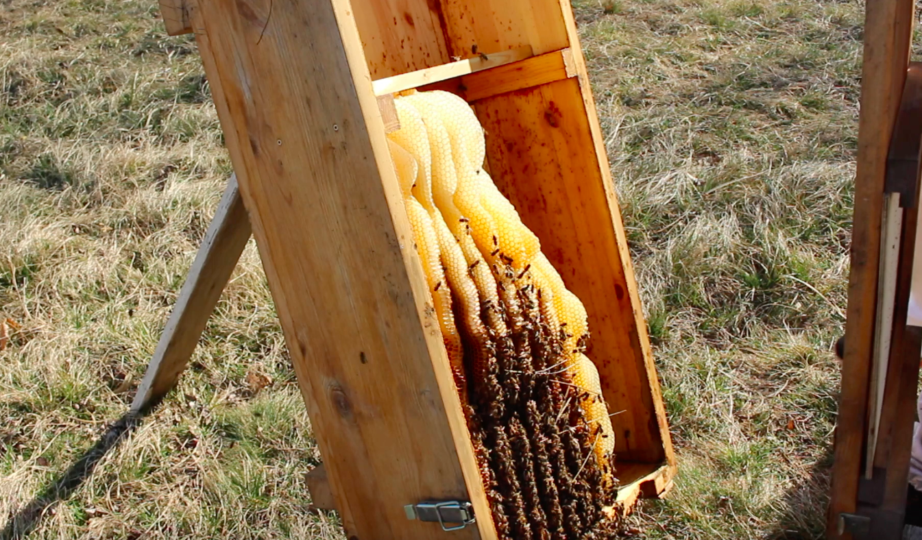 Dieses Volk ist nach der Bauerneuerung im letzten Jahr in diese Bienenkiste neu eingezogen. Es hat sich im ganzen Jahresverlauf gut entwickelt und ist auch gut über den Winter gekommen. Knapp 2/3 der Bienenkiste sind ausgebaut.