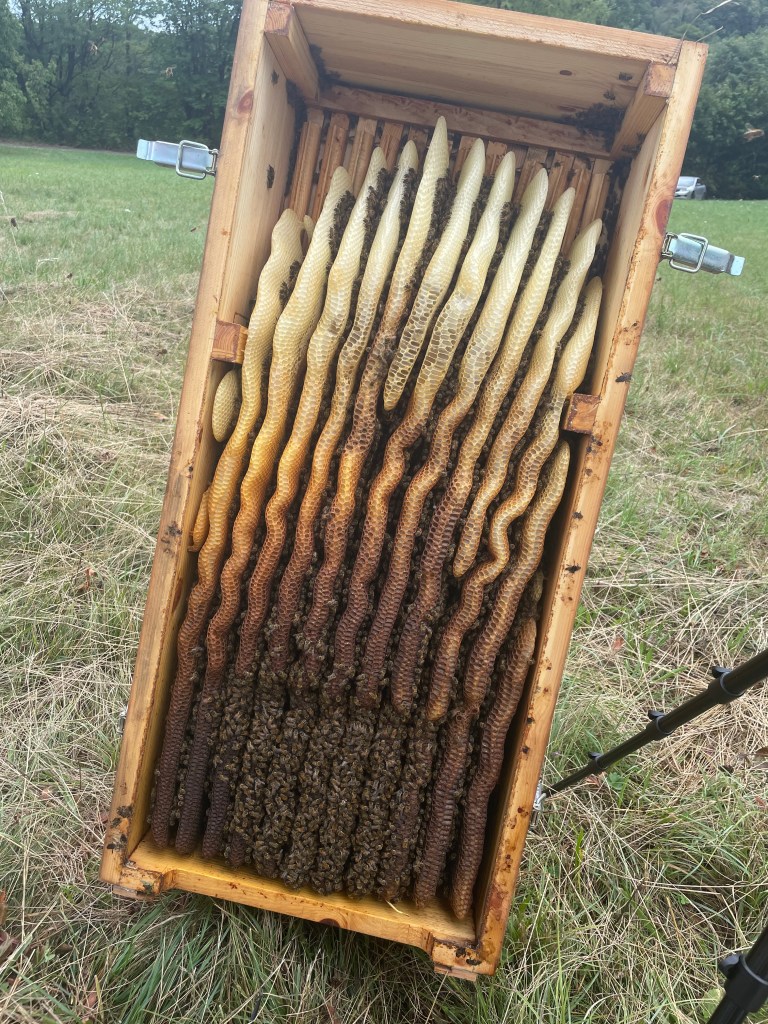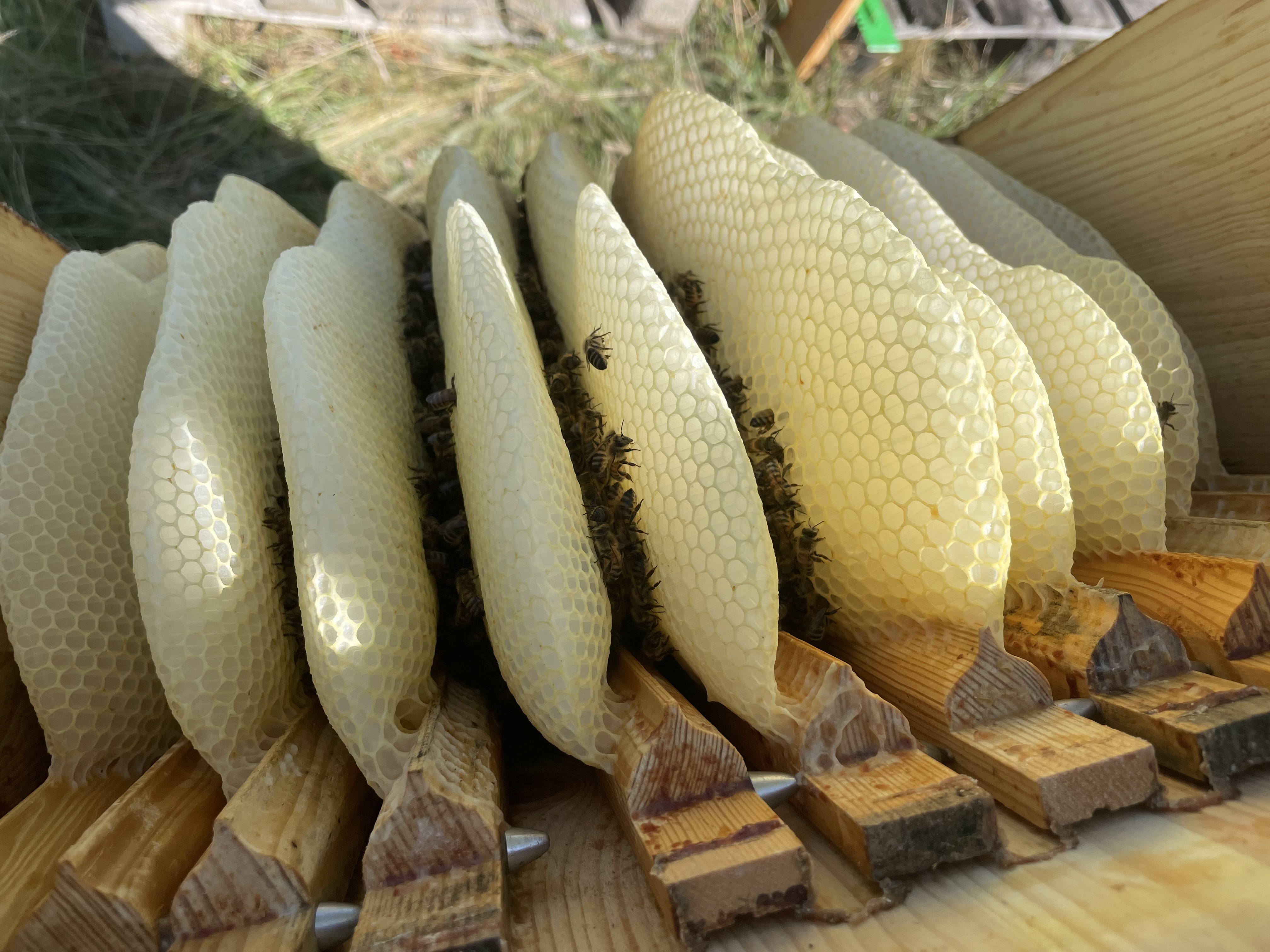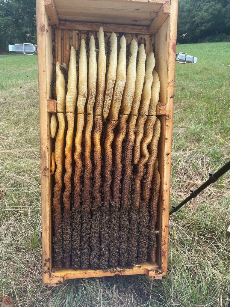Im Honigraum verwende ich Schiffsrumpfleisten, das heißt auch hier bauen die Bienen alles im Naturwabenbau ohne Fremdwachs.