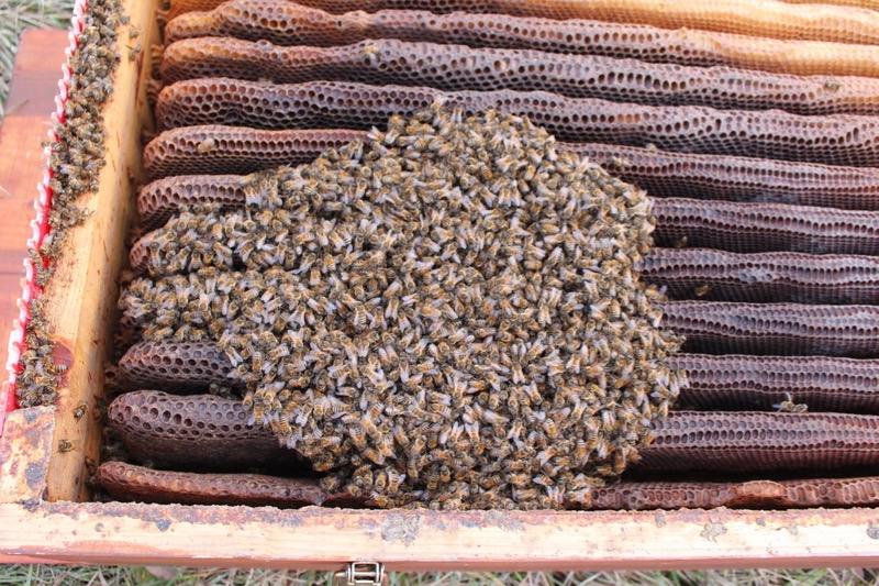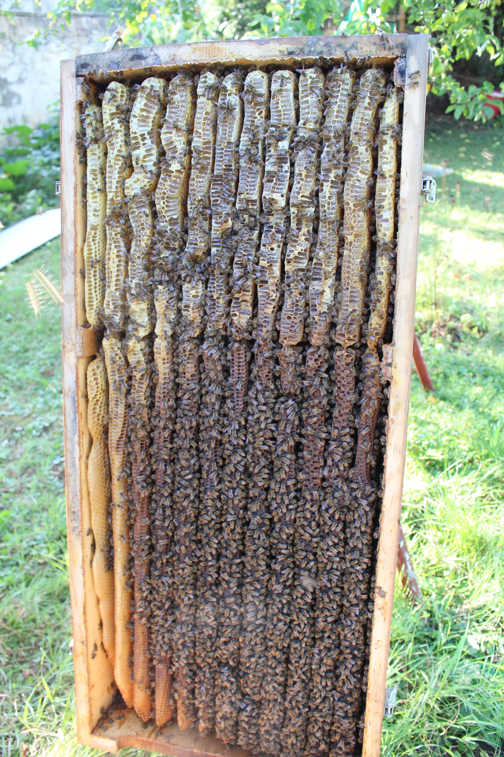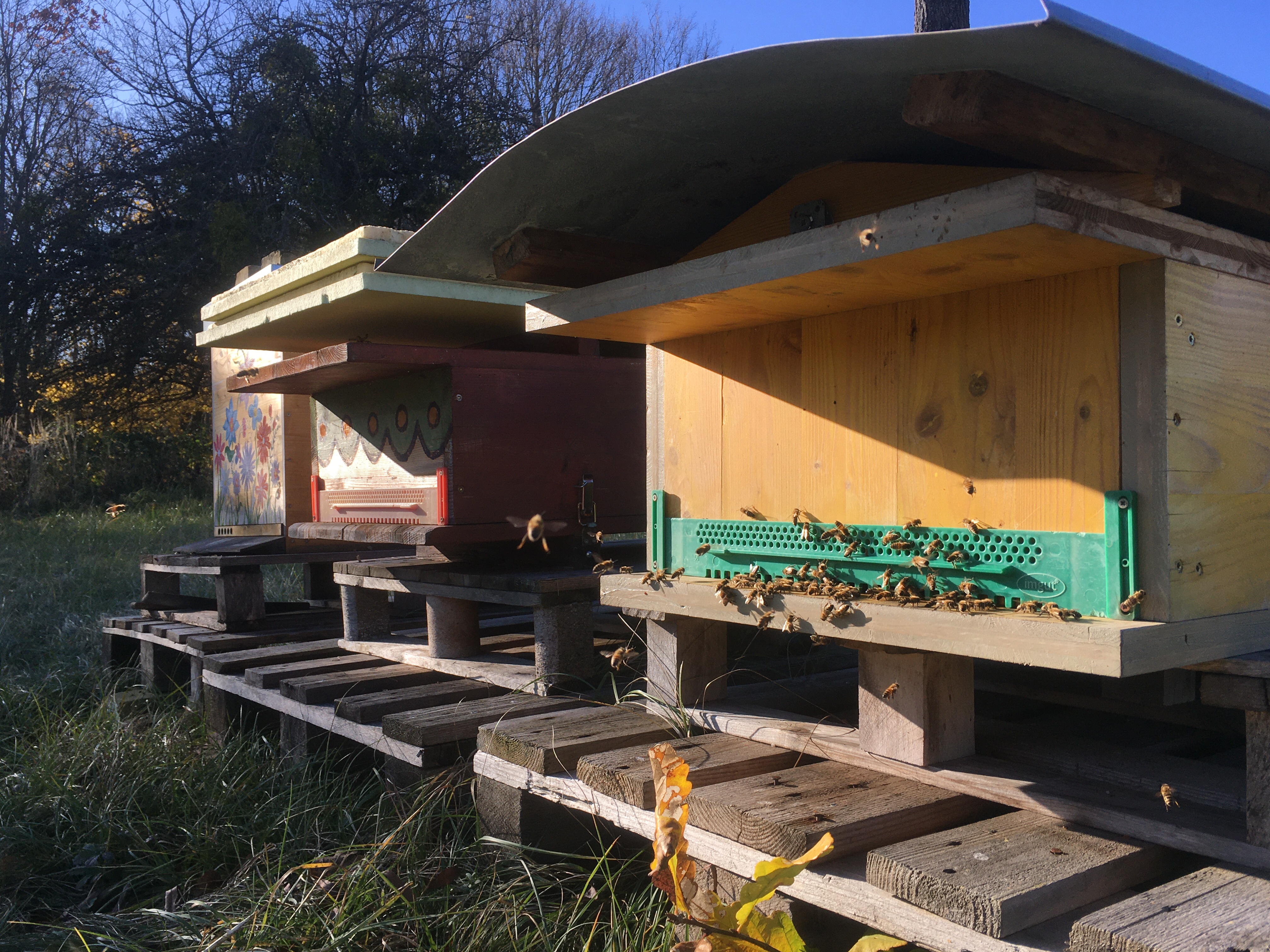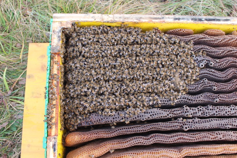 Das Volk in der Bienenkiste war über das Jahr hinweg extrem stark, ist nicht geschwärmt (zumindest konnte ich weder einen Schwarm noch weniger Bienen feststellen), hat 11 kg Honig gebracht und sitzt jetzt recht klein auf 4,5 Wabengassen. Hätte ich mir jetzt anders erwartet, aber es ist vital und ich hab mich sehr gefreut, dass es ihnen gut geht.