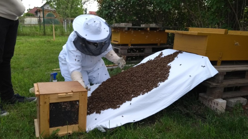 Die Bienen ruhig so nah wie möglich zur Beute abstossen, damit sie nicht so weit zum laufen haben ….und der Bienenhaufen vergrössert sich sowieso schnell nach unten, wenn er auseinander quillt.